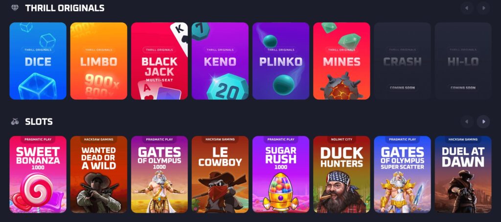 Thrill has thousands of slots, table games, live dealers, and its own provably fair Thrill Originals, plus a full sportsbook with many sports and esports markets.