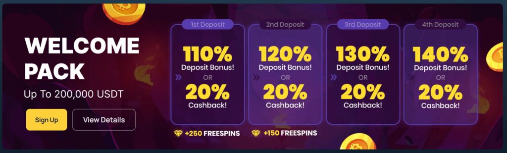 - 🔁 Bonus on First 4 Deposits: Combined packages up to ~5 BTC total with jackpots and spins